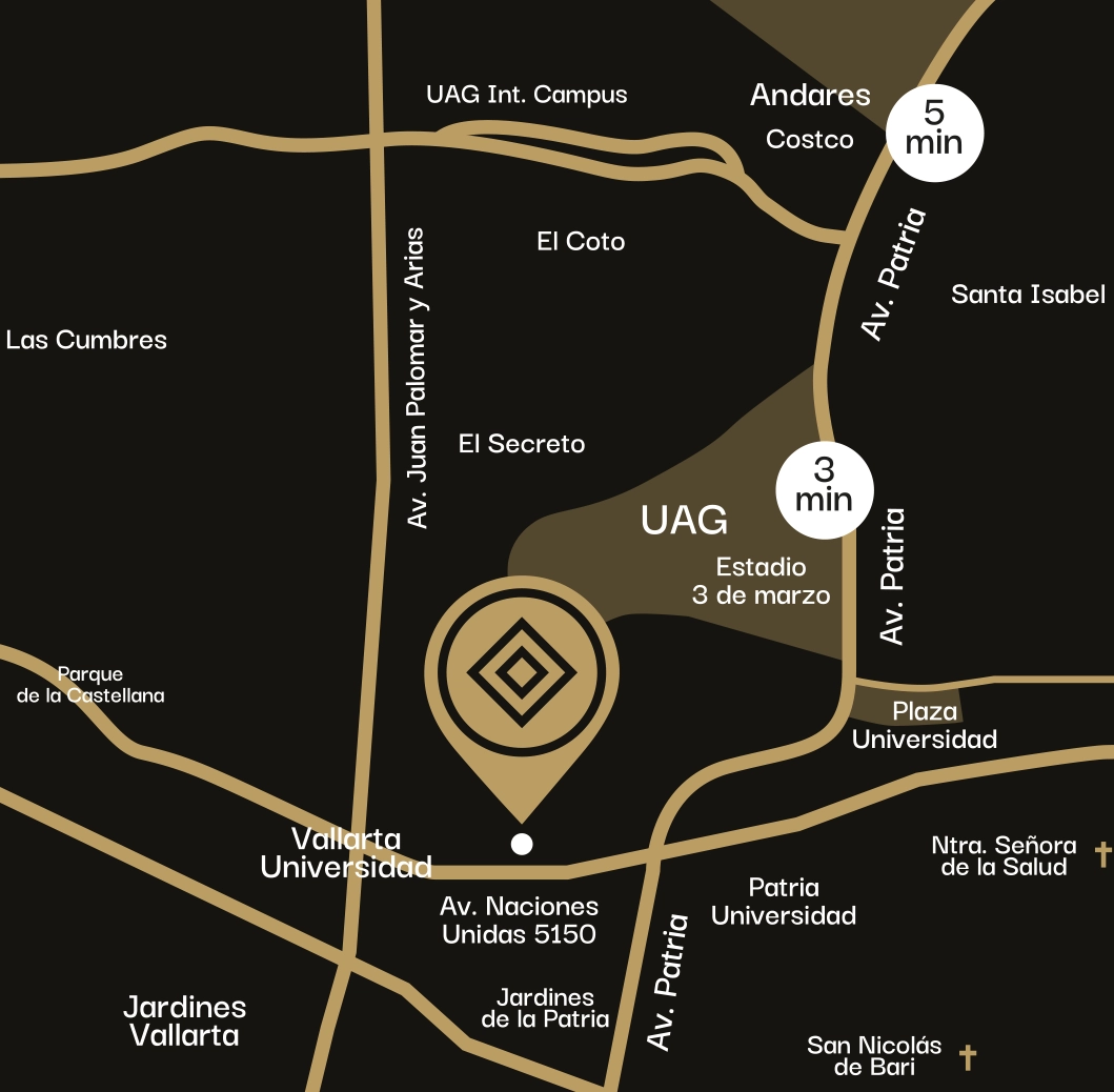 Vive a pasos del icónico Andares, el epicentro de la vida sofisticada en Guadalajara. Con fácil acceso a las principales vialidades, disfruta de la comodidad de estar cerca de los mejores restaurantes, tiendas de lujo, centros médicos, y colegios de alto prestigio.