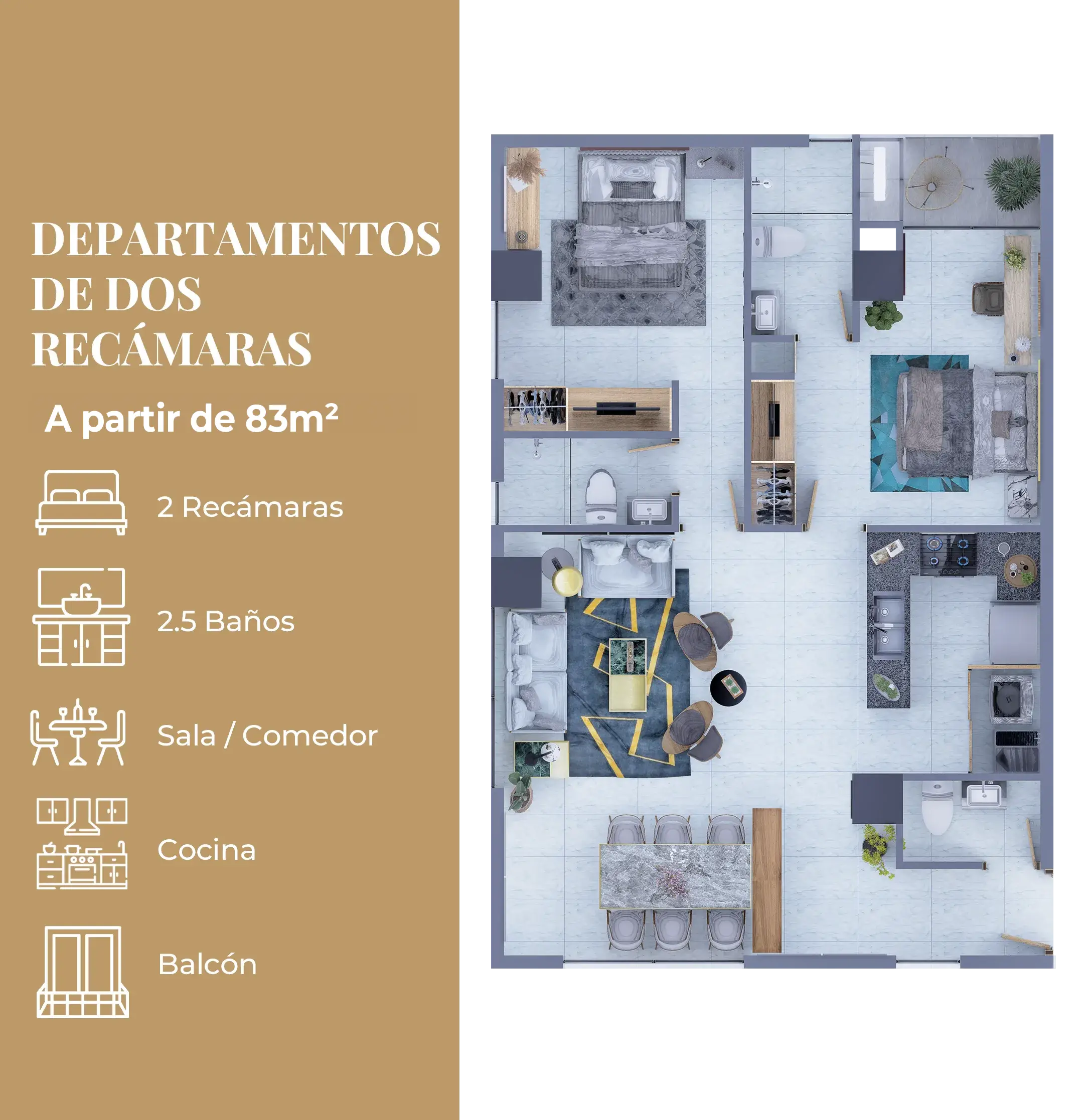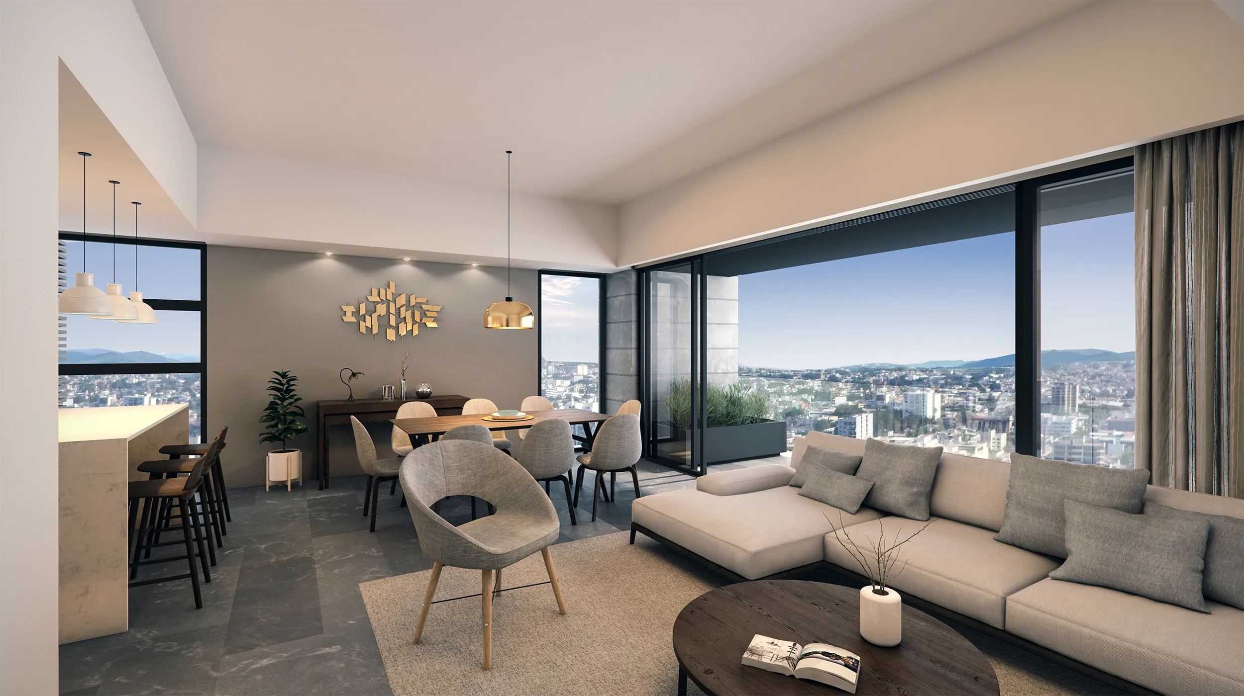 Residencias de 104 a 179 m² con vistas de 180°, acabados premium, techos altos y diseño elegante y funcional.